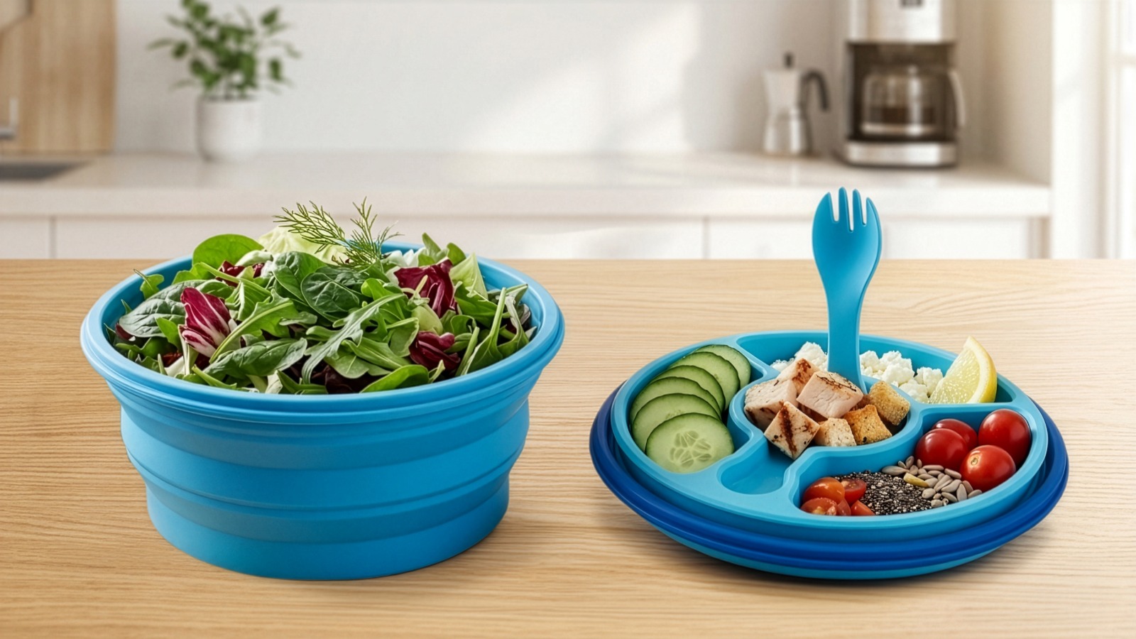 The Portion Perfect Deluxe Collapsible Salad Bowl is a portable, BPA-free container designed for healthy portion control, featuring a collapsible silicone base for easy storage, a toppings tray, and an included spork. It is top-rack dishwasher safe and allows for easy transport of vegetables, fruits, grains, and proteins.